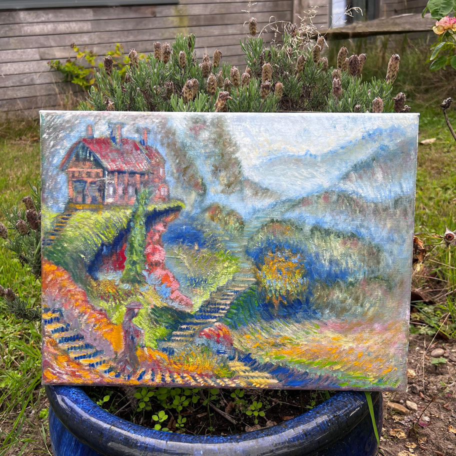 A lone figure follows winding paths through rolling hills toward a distant house glowing with warmth. In its shifting colours and textured brushwork, the painting speaks of return, refuge, and the quiet poetry of the land.